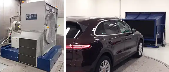 Bộ mô phỏng Fahrtwind nhỏ gọn được phát triển đặc biệt để sử dụng trong các bộ Dyno kiểm tra khung gầm, nhưng cũng có thể được sử dụng phổ biến cho các Buồng Môi Trường Chamber mô phỏng làm mát hoặc luồng không khí khác. Chúng được đặc trưng bởi thực tế là có thể đạt được tình huống lắp đặt cực kỳ tiết kiệm không gian nhờ độ lệch không khí 90°. Các thiết bị thậm chí có thể được đặt trực tiếp trên tường mà không làm ảnh hưởng đến các giá trị khí động học. Đây là nơi mà quạt tiếp tuyến (linear Fan) của chúng tôi thực sự phát huy tác dụng: luồng không khí đồng đều trên toàn bộ chiều rộng cửa ra của quạt.